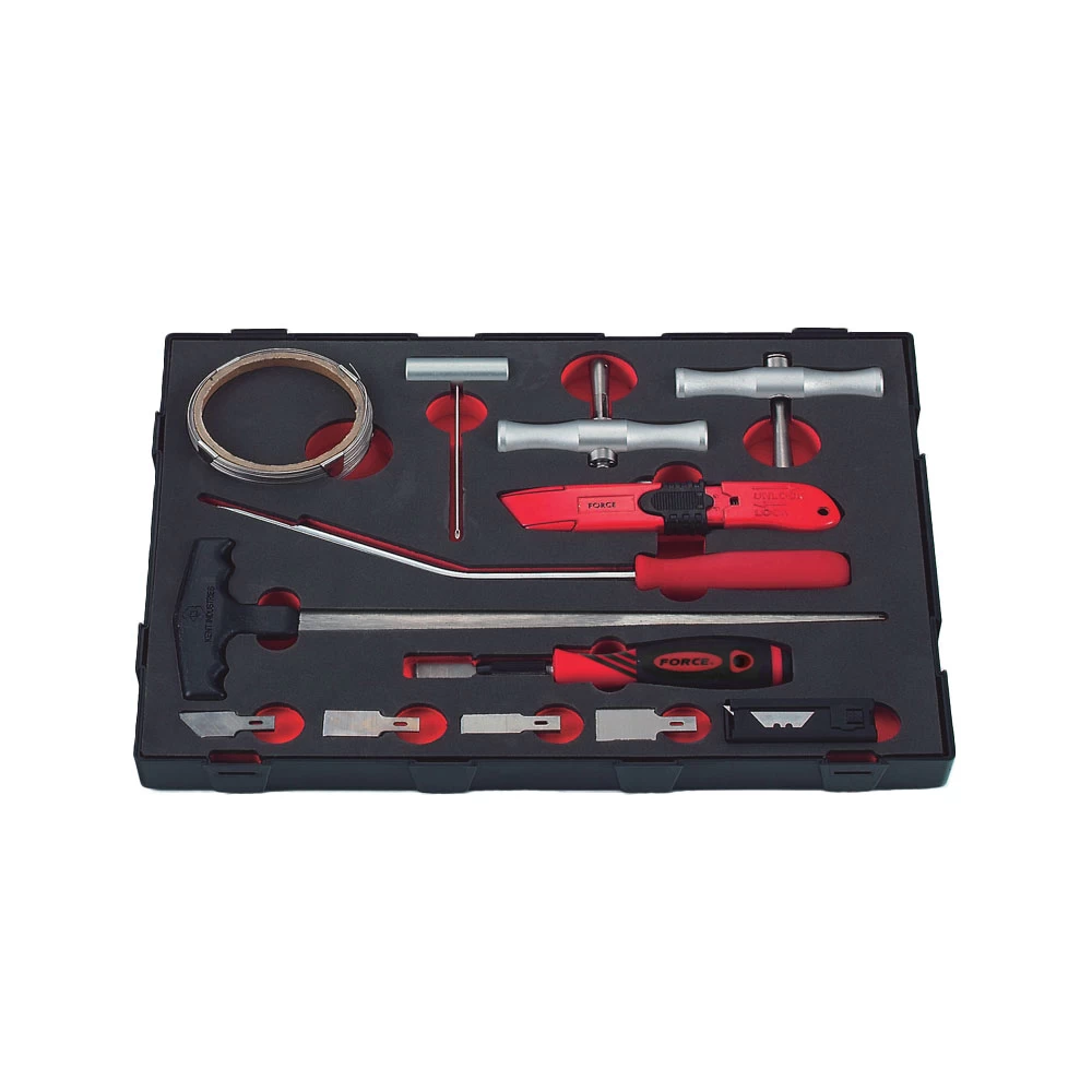 Autoruit demontage set met verschillende accessoires.