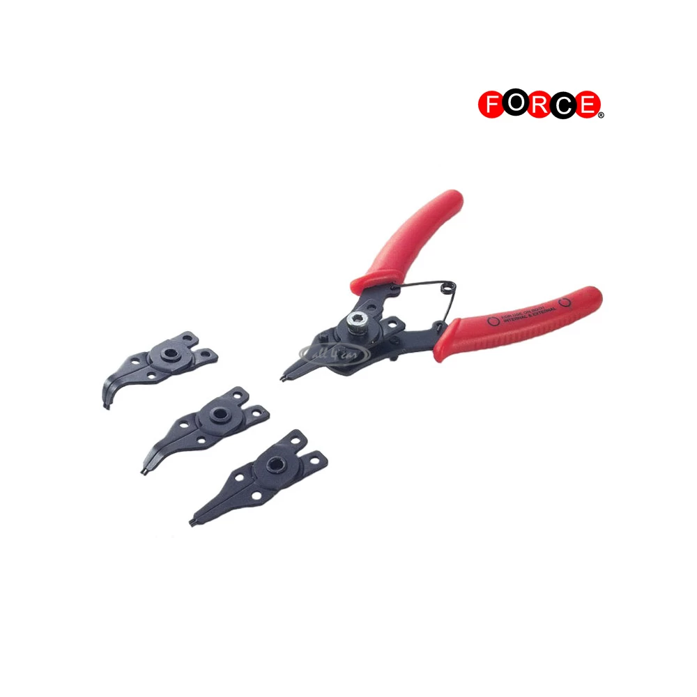 Force 4-Delig Interne en Externa snap ring tangen set. Deze circlip tangen set bevat 4 gemakkelijke uitwisselbare koppen, waaronder 2 rechten , 1 met 90° hoekpunt en 1 met 45° hoekpunt. Het effectieve bereik 10-50mm ( 3/8’’ – 2’’ )