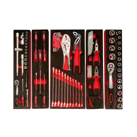 De kist vouwt zich als het ware open in 5 vakken waarin het gereedschap is verwerkt in een luxe foam in-leg.