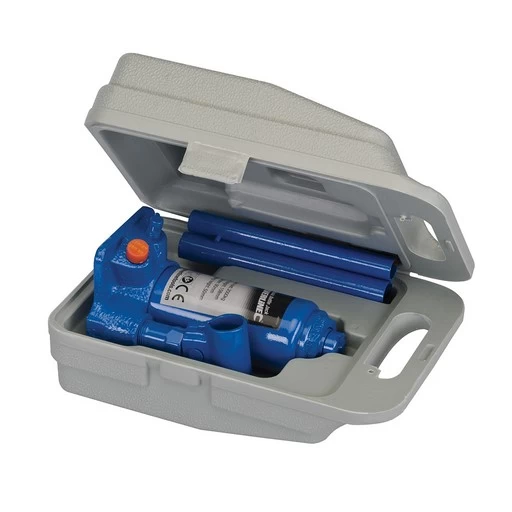 Compacte, krachtige hydraulische potkrik met een schroef-verstelbaar krikzadel en draagkoffer.