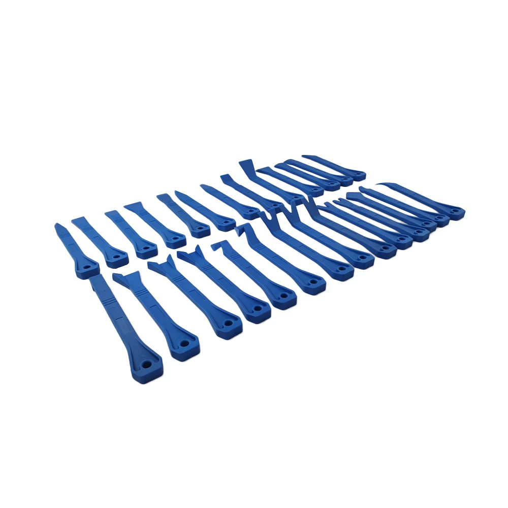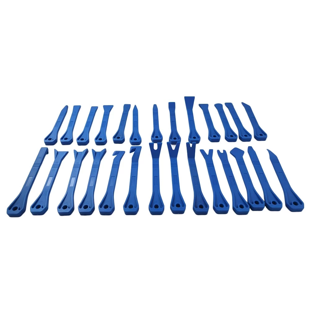 Zeer uitgebreide set van 27 praktische kunststof schrapers, wiggen en montagehulpen voor demontage van de meest uiteenlopende bekledingspanelen, sierlijsten, afdekkapjes, bedieningsorganen, wieldeksels, voertuigemblemen etc.
