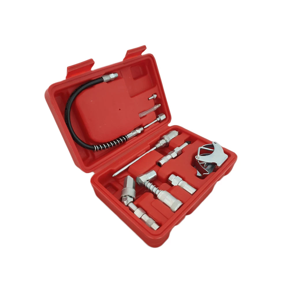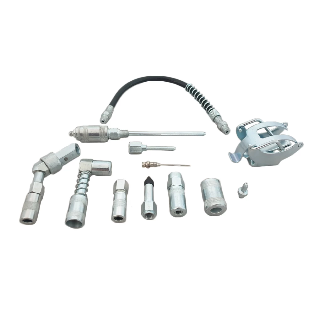12-delige vetspuit adapterset voor de meest voorkomende hand & pneumatische vetspuiten. Geschikt voor smeernippels van staal, roestvrij staal en messing.